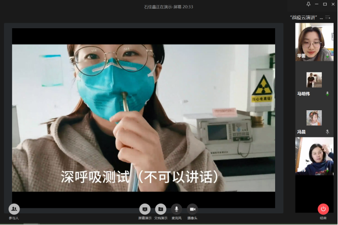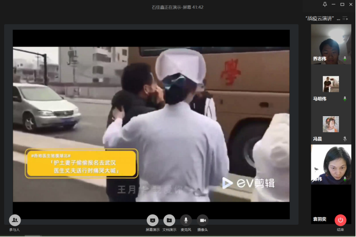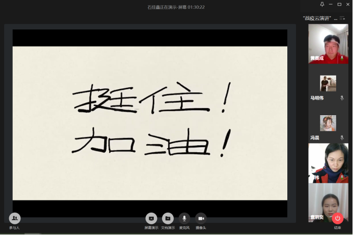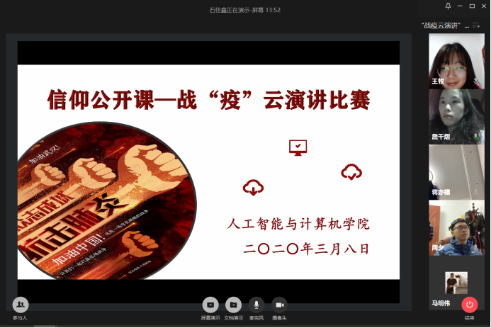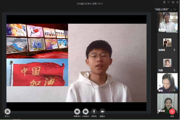 主办的战“疫”云演讲比赛正式线上举行。学院党委副书记副院长陈祎,学院辅导员沈丹、王牧以及班主任老师蒋亦樟、詹千熠、范超、潘祥和学院学生代表50余人共同出席本次活动。