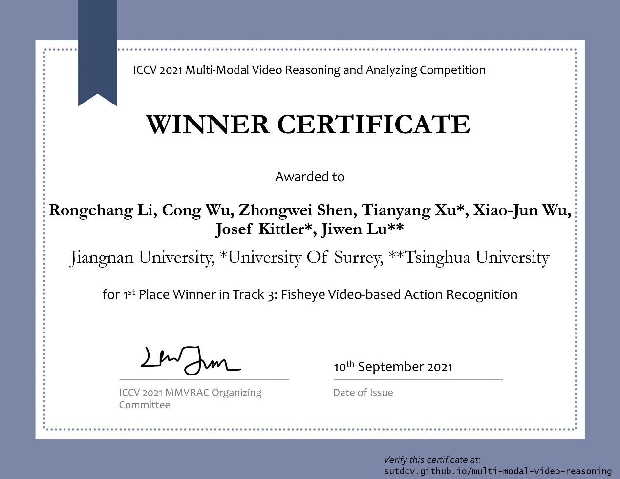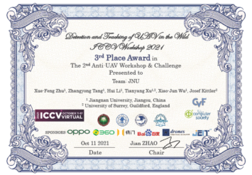 此前,在2021下半年人工智能领域顶级会议国际计算机视觉大会(IEEE International Conference on Computer Vision, ICCV2021)上,我校团队与英国Surrey大学和清华大学合作荣获了多模态视频推理分析比赛MMVRAC中2项冠军(吴聪,李荣昌,沈忠伟,徐天阳,吴小俊,JosefKittler,鲁继文)和第二届CVPR反无人机Anti-UAV跟踪竞赛季军(朱学峰、汤张泳,李辉,徐天阳,吴小俊,JosefKittler)。近年来我校大力推进市校合作和国际合作,大力支持人工智能快速发展,我校在人工智能领域获得的这些重要荣誉和奖项,将进一步提高国产直播