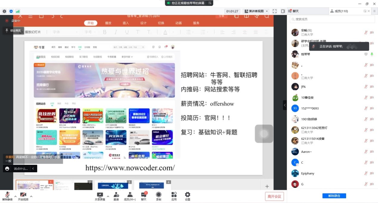 于4月10日举办了线上求职经验分享交流会-互联网就业专场。李重阳、钱琴琴、毛腾飞、吴双四位拿到互联网大厂offer的同学积极分享自己的求职经验,传授应聘技巧。此次线上分享会共有145名同学参加。