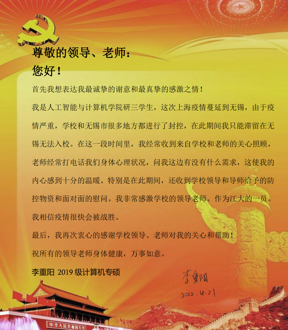 守望相助、共克时艰是最有效的防护;众志成城、患难与共是最有力的阻击。往返驱车60余公里,给学生送去的不仅是温暖与感动,更给全体学生传递出学院以学生为中心的发展思想。我们相信没有一个寒冬不会过去,没有一个暖春不会到达,没有一个梦想不会开花,国产直播