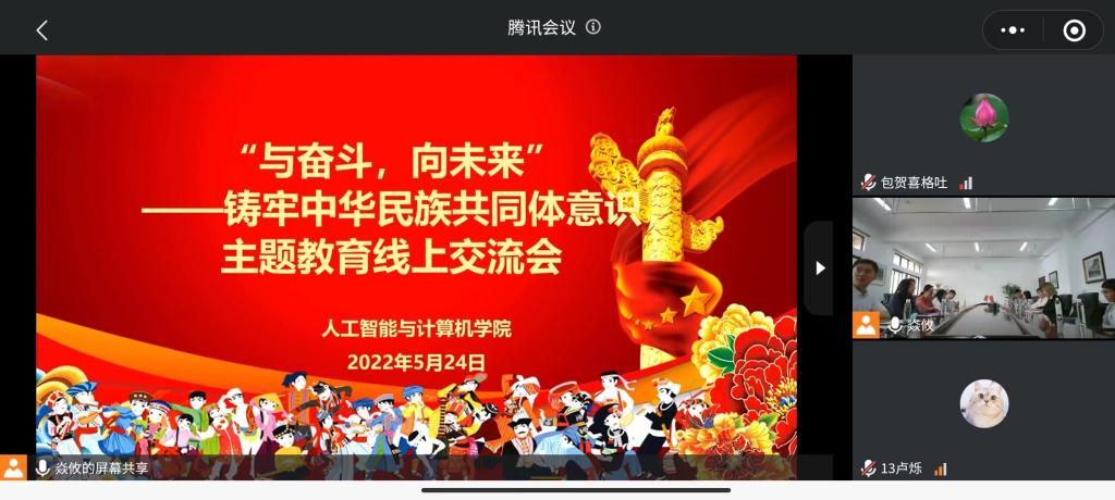 于5月24日在智能楼610开展“与奋斗,向未来”——铸牢中华民族共同体意识主题教育交流会,本次交流会采取线上与线下相结合的方式,共计100余名师生参会。国产直播