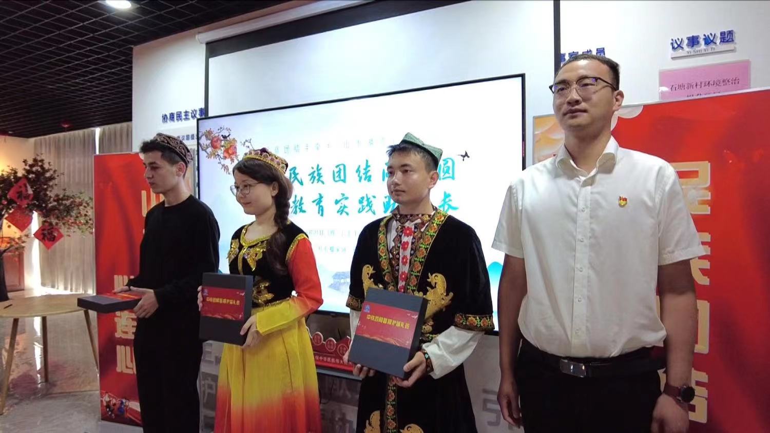 民族生特色工作情况。石塘社区干部为“普”公英——新疆、西藏地区普通话推广社会实践团队学生代表发放假日护苗礼包。