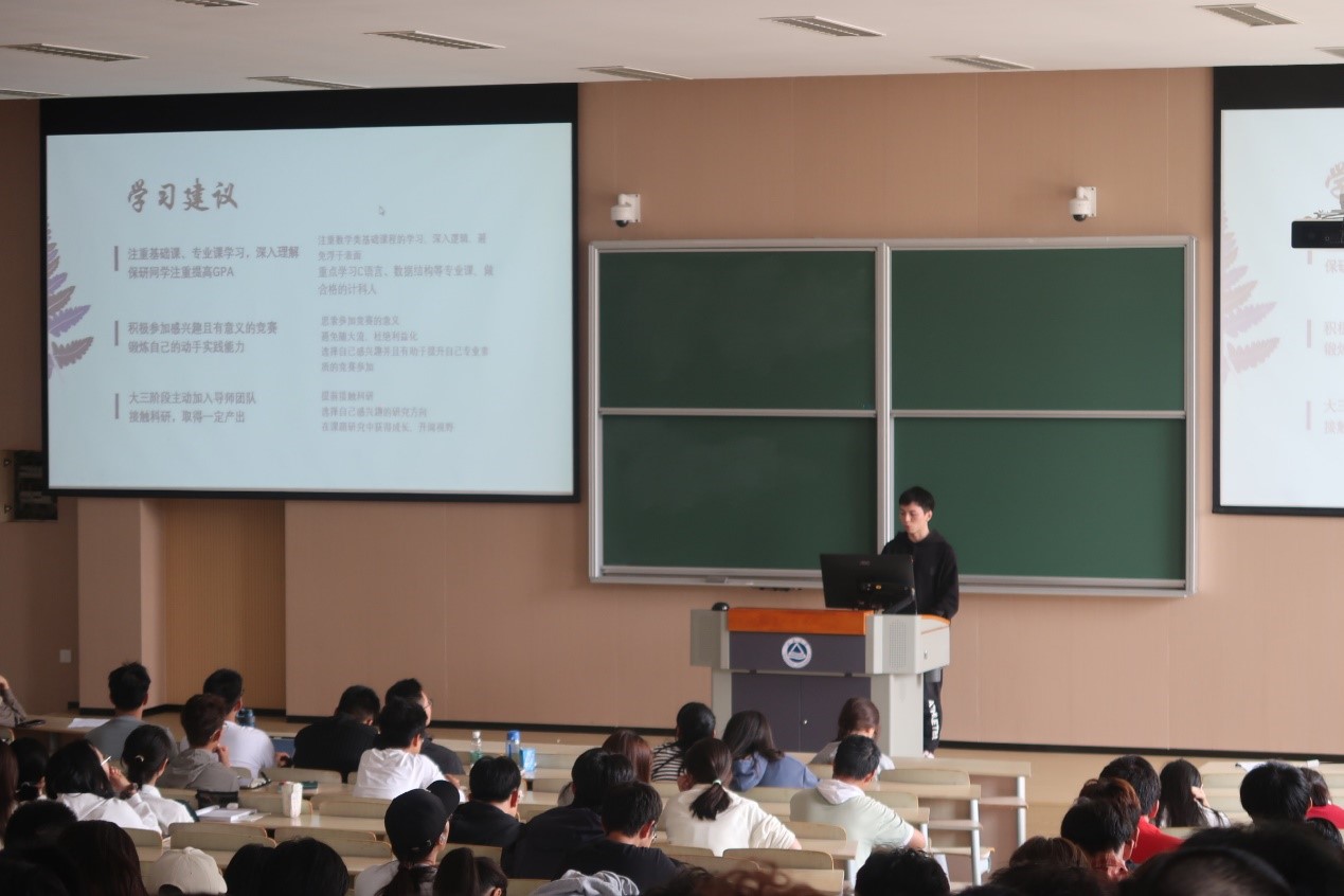 马佳芮同学从“学习是第一要务”、“科创是锦上添花”、“跨专业保研设计”三个方面进行了学习经验分享。鼓励学弟学妹们大一期间打好知识基础,在学期间积极参加科研竞赛,多看、多练、多学习,不断充实自我,不断成为更好的人。